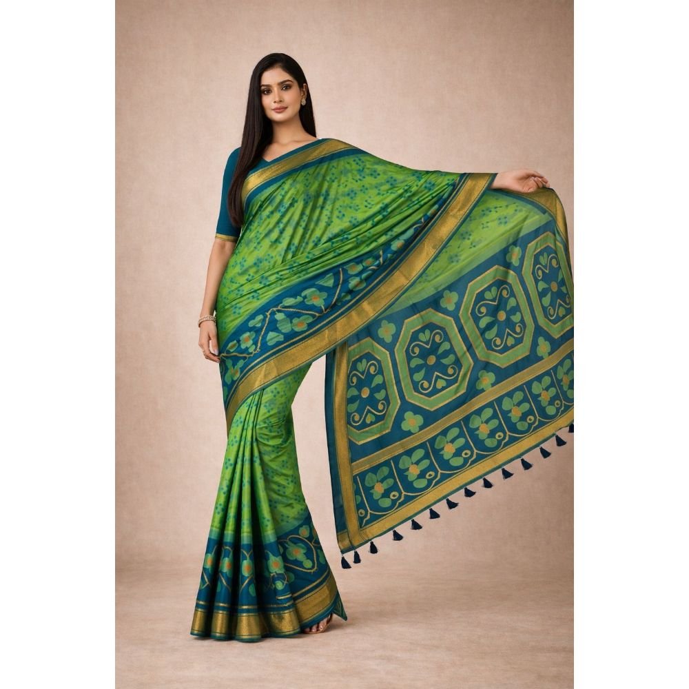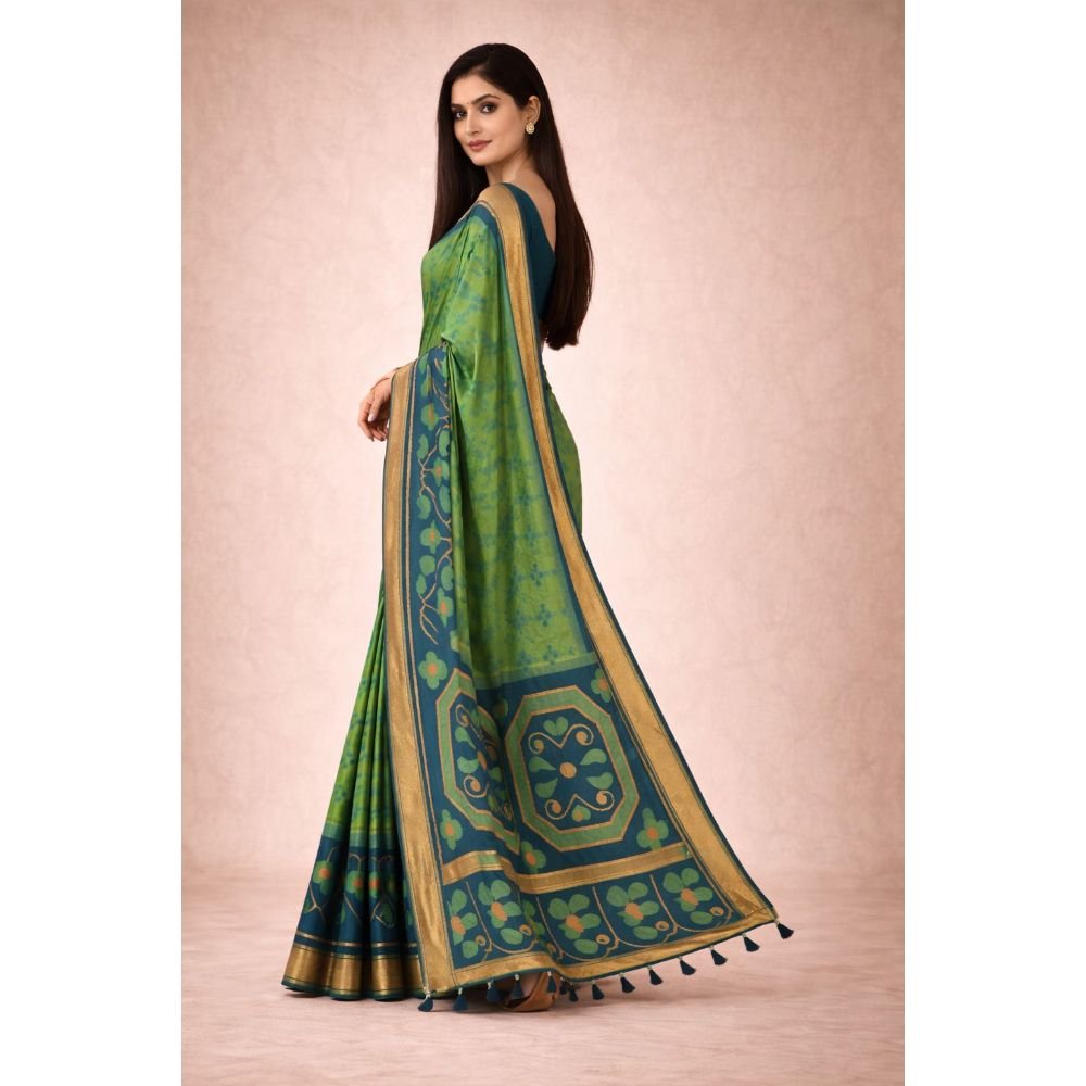 Step into elegance with this beautiful Parrot Green & Teal Blue Silk Blend Saree, crafted to give you a graceful and refreshing ethnic look. The vibrant green body is enhanced with a rich teal blue border and pallu, featuring intricate floral and geometric patterns with golden accents.