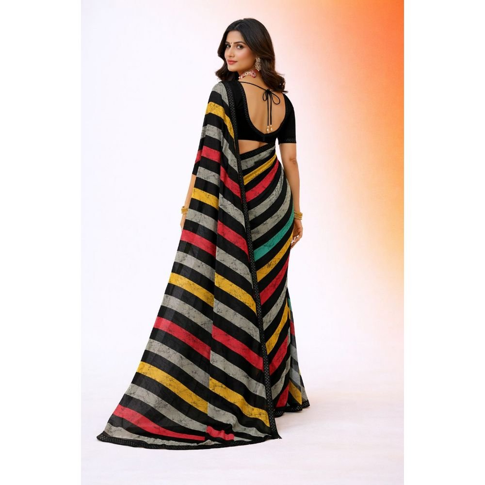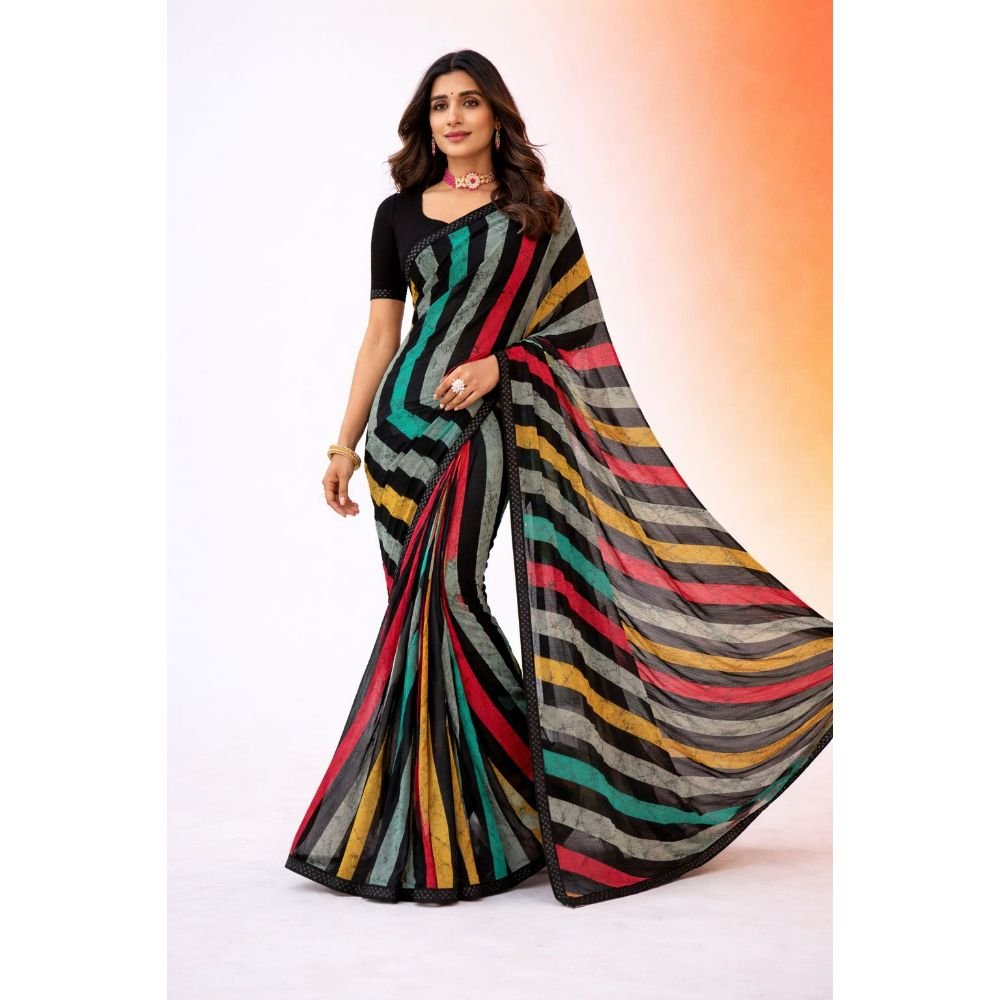 Apne wardrobe mein ek modern touch add karein is bold Multicolored Striped Saree ke saath. Black border aur vibrant colors ka combination isse kaafi chic aur stylish banata hai. Ye saree un logo ke liye hai jo traditional mein thoda contemporary style pasand karte hain.