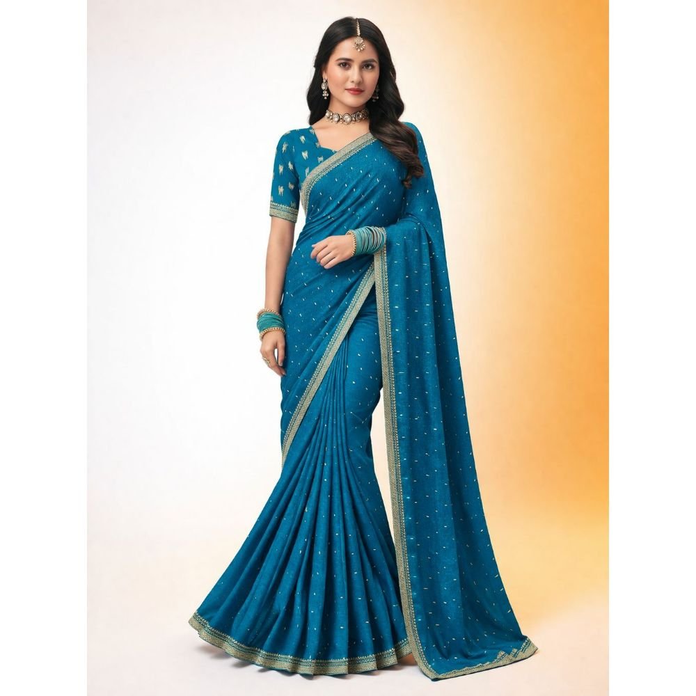 Ek sophisticated aur classy look ke liye ye Teal Blue Saree ek perfect choice hai. Gold butti work aur ek sundar gold lace border isse kisi bhi evening function ke liye khas banate hain. Iska drape itna smooth hai ki ye har body type par fit baithti hai.